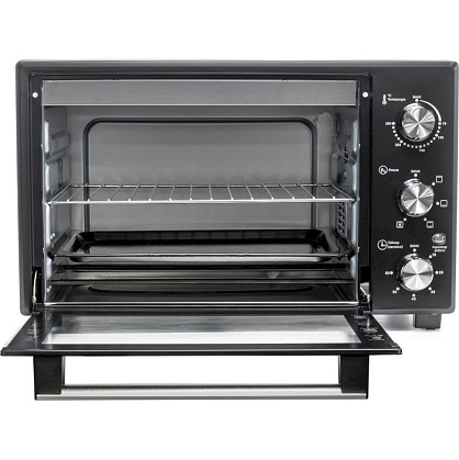 На лицьовій панелі електропечі розташований механічний регулятор температури. Термостат дозволяє встановлювати температуру від 70°С до 250°С. Гаряче повітря всередині печі розподіляється рівномірно, не даючи страві пригоріти, навіть при найвищій температурі. Функція настройки теплового режиму дозволяє якісно обробляти продукти, як при сильному нагріванні (при 250°С), так і при легкому термічному впливі.