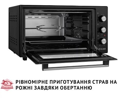 У комплекті електропечі міститься решітка, кругле та універсальне деко. Решітка ідеально підходить для страв, які зазвичай готуються у формі або сковороді. Кругле деко використовується для піци та запіканок, а універсальне деко підходить для різноманітних страв, включаючи ті, що містять багато рідини.