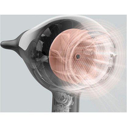 Ця високопродуктивна модель з потужністю 2100 ЕВт для потужного повітряного потоку, а покращений мотор забезпечує безшумність роботи фена на рівні 66,5 дБА - рівень, який ледь перевищує рівень повсякденної розмови.