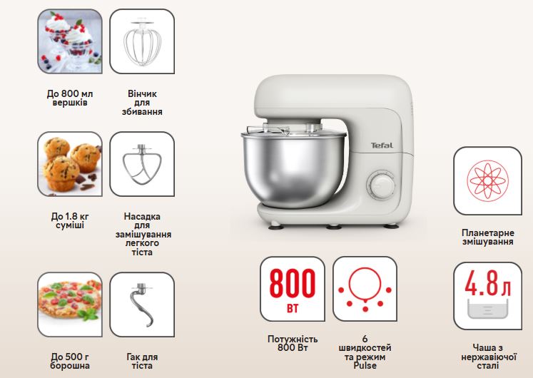 В ній ідеально все: потужний мотор на 800 Вт, 6 швидкостей, планетарне змішування. Різноманіття насадок дає повну свободу для втілення чималої кількості рецептів. Від пишного тіста до ніжних мусів – з цим приладом обмежень не існує.
