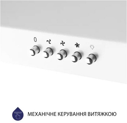 Сучасна панель управління дозволяє без зусиль керувати витяжкою. П’ять механічних кнопок розташовані на фронтальній частині моделі.