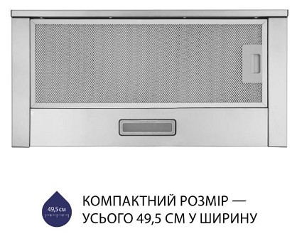 Витяжка зі стандартною шириною 49.5 см ідеально підходить для використання з варильною поверхнею такого ж розміру, який є універсальним для більшості кухонних приміщень.