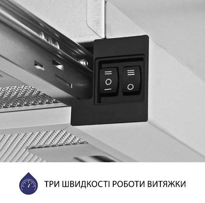 Витяжка має 3 швидкості роботи. Необхідна швидкість обирається виходячи з інтенсивності забруднення повітря кухні. Кожній швидкості характерна різна продуктивність: