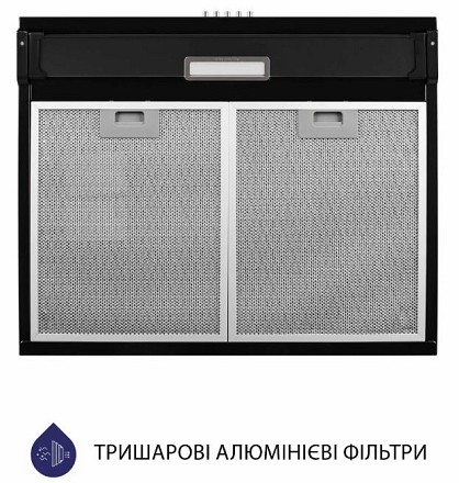 Кухонна витяжка Minola HPL 614 BL обладнана двома захисними алюмінієвими жировими фільтрами. Вони виготовлені з декількох шарів алюмінієвої сітки, що забезпечує надійний захист двигуна та інших деталей від потрапляння жиру та бруду. Очищення алюмінієвих фільтрів слід проводити кожні 2-3 місяці вручну в мильному розчині або у посудомийній машині.