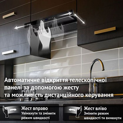 Сенсорна панель управління та керування жестами є вагомими перевагами кухонної витяжки. Одне натискання або легкий помах руки — і потрібний режим роботи або освітлення активовані.