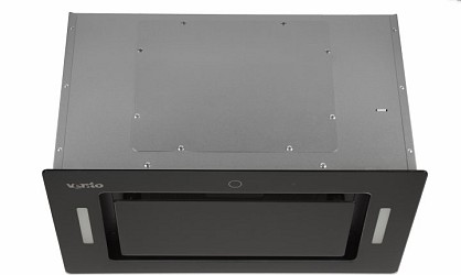 Модель встановлюється в кухонні меблі замість днища, отже, Ви бачитимете тільки її низ, а він покритий склом в елегантному чорному кольорі. На склі розташовуються сенсорні кнопки, а між ними — цифровий дисплей. Відмінність цієї моделі також у розташуванні світильників — зліва і справа на бічних панелях, як результат, маємо ефективніше освітлення зони під витяжкою.