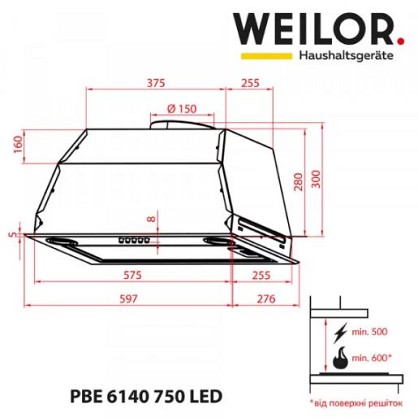 Повновбудована витяжка Weilor PBE 6140 SS 750 LED ефективно впорається з покладеним на неї завданням. Вона швидко усуває запахи, випари та кіптяву, дбаючи про чистоту повітря на кухні і, відповідно, про ваше здоров'я.