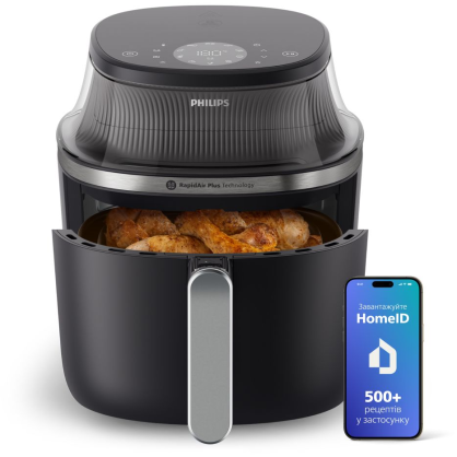 Насолоджуйтесь смачною їжею, яка містить до 90% менше жиру*. Запатентована технологія RapidAir Plus з унікальною конструкцією у формі зірки має більшу швидкість потоку, забезпечуючи циркуляцію гарячого повітря навколо та крізь страву**, завдяки чому вона готується рівномірно всередині та зовні, а ви отримуєте смачну домашню страву.