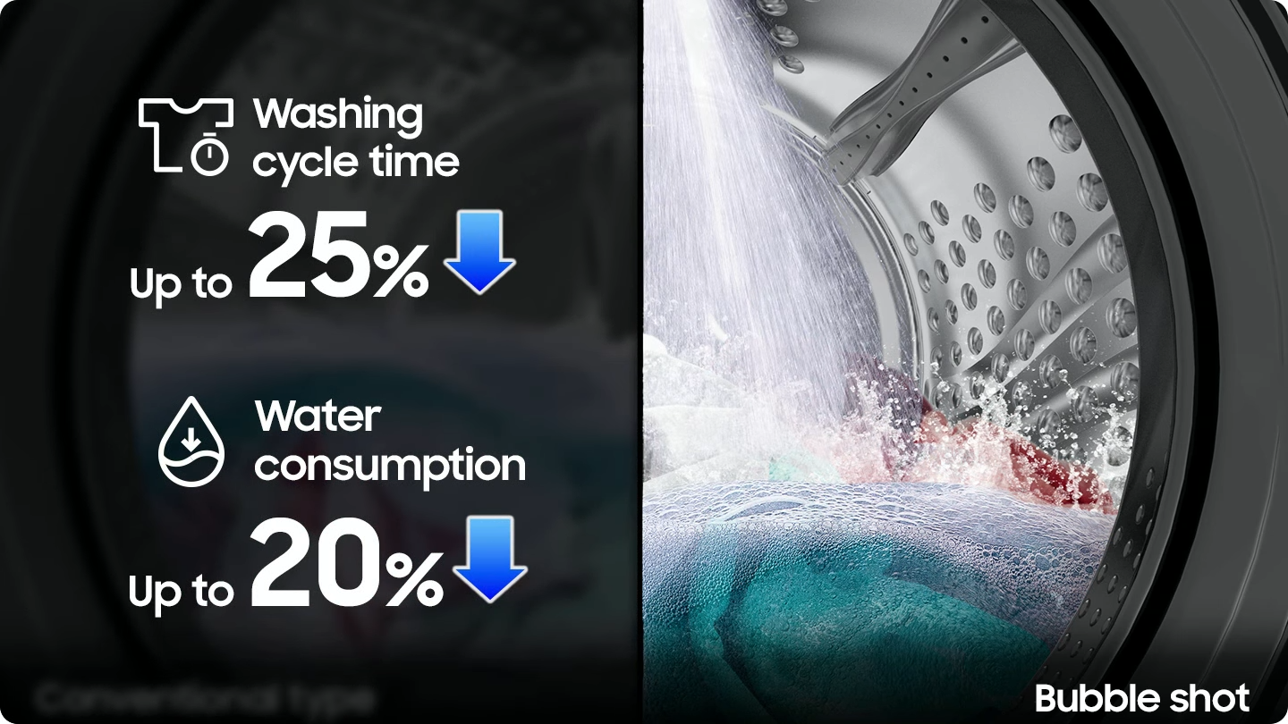 *Внутрішні випробування Samsung з режимом «Бавовна» на моделі WW7400D показали зниження витрати води і часу в порівнянні з машиною без технології Bubble Shot. Фактичні результати можуть відрізнятися.