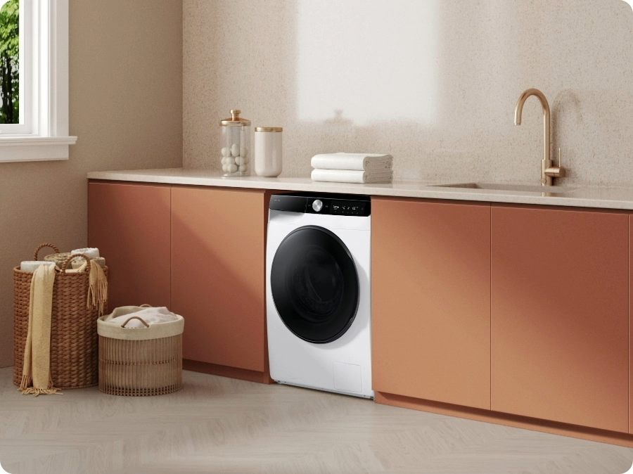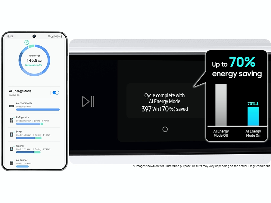 *Для коректної роботи потрібно Wi-Fi-з'єднання, обліковий запис Samsung і сумісний пристрій на базі Android або iOS. **Ефект досягається при температурі прання 20–40 °C, максимальна економія — при пранні на 40 °C в режимі холодної води. ***На основі внутрішніх тестів моделі WW11BBA049AB: звичайне споживання — 0,539 кВт·год, з активним режимом AI Energy — 0,145 кВт·год. Результати можуть варіюватися залежно від умов експлуатації.