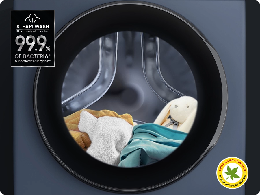 Режим гігієнічної обробки парою направляє гарячу пару знизу барабана, ефективно усуваючи до 99,9% певних бактерій, стійкі забруднення та алергени, включаючи кліщів домашнього пилу. Це допомагає знизити ризик алергічних реакцій і зробити прання максимально безпечним для здоров'я.