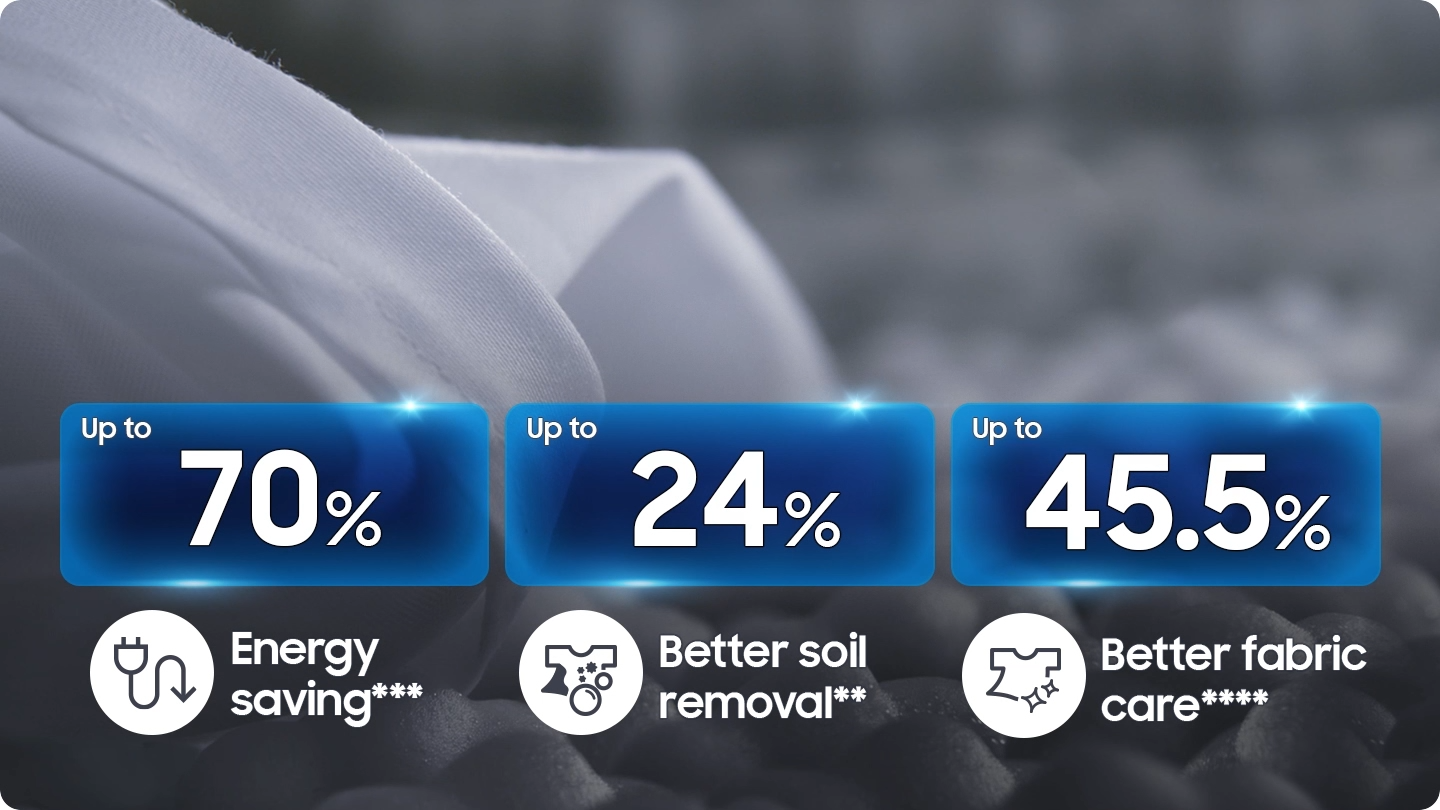 *Функція доступна в певних режимах. ** Дані отримані на основі досліджень Springboard Engineering з використанням смужок EMPA. *** У порівнянні з традиційним пранням в теплій воді. Результати отримані за стандартом IEC 60456-2010, завантаження 4 кг, режим Super Eco Wash в холодній воді (модель WF80F5E5U4W) і порівнювалися з програмою «Бавовна 40°C» без Ecobubble™ (WF0702WKU). **** Випробування на моделі 9 кг (WF906U4SAGD) на синтетиці, з і без Ecobubble.