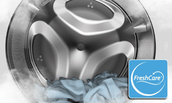 Після завершення прання, функція FreshCare + зберігає запах одягу і запобігає поширенню запахів усередині пральної машини. Завдяки поєднанню гарячої пари й періодичних дбайливих рухів барабана, білизна провітрюється і залишається свіжим, навіть після прання.