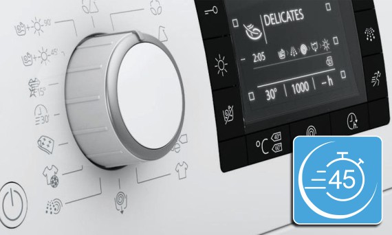 Це програма ідеальна для швидкого прання та сушіння злегка забрудненої бавовни й синтетичних тканин. Протягом даного циклу, 1 кг білизни буде випраний і висушений всього за 45 хвилин.