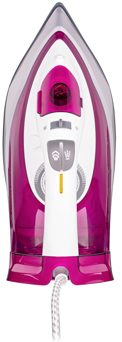 Праска у малиновому кольорі з потужністю 2200 Вт, керамічним покриттям підошви, резервуаром на 300 мл, функцією пари, а також захистом від накипу та системою “крапля-стоп”.
