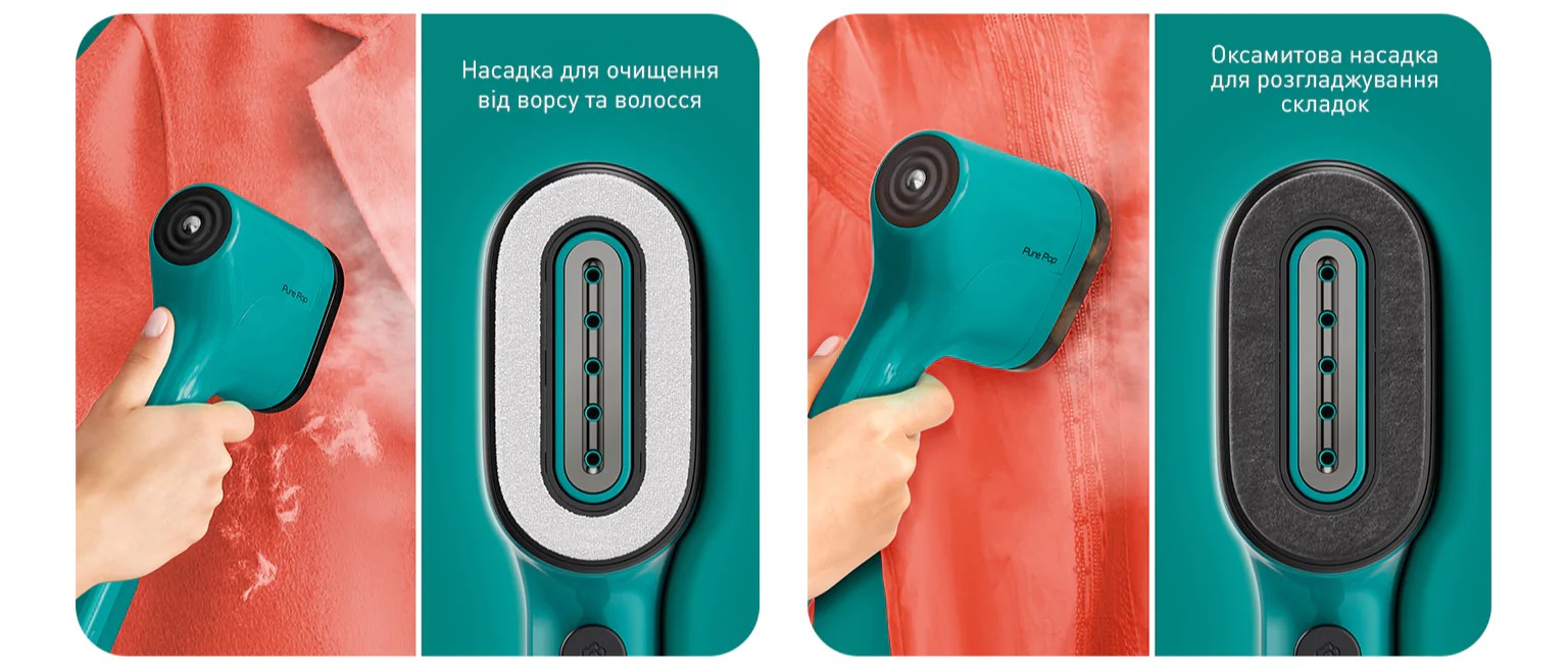 Розгладьте складки та освіжіть без жодної шкоди для ваших текстильних виробів з оксамитовою насадкою для плавних рухів. Видаляйте все волосся та ворсинки з вашого одягу, щоб освіжити та очистити тканину.