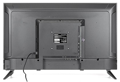 Телевізор має елегантний чорний корпус із міцного матеріалу, який забезпечує довговічність і стильний вигляд. Конструкція включає стійкі ніжки, що додають стабільності, а стандарт кріплення VESA (100x100 мм) дозволяє легко закріпити телевізор на стіні.