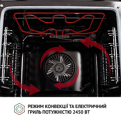Модель має 6 рівнів знімних хромованих напрямних, які надають можливість розміщувати посуд різного розміру та форми одночасно, забезпечуючи рівномірний нагрів страв.