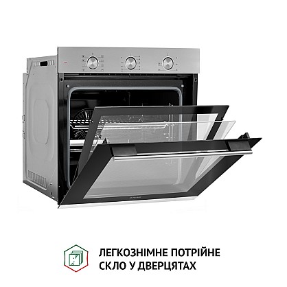 Потрійне загартоване скло дверці робить духову шафу безпечною і підтримує стабільний рівень температури всередині, при цьому дверцята залишаються безпечними при торканні.