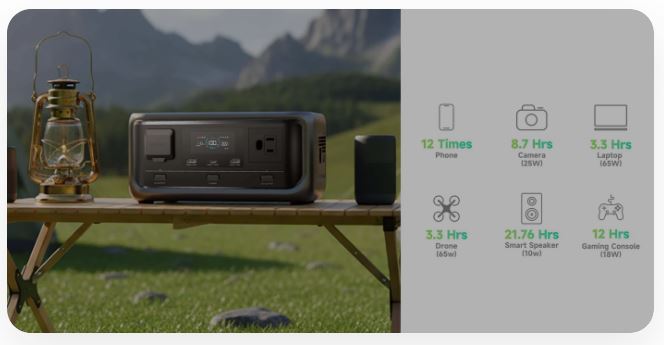 VOLIX P300 — це легка та портативна електростанція, розроблена для задоволення ваших потреб у електроенергії в дорозі, що дозволяє вам залишатися повністю зарядженими в будь-який час і в будь-якому місці. Ця електростанція важить лише 3,57 кг і має максимальну потужність 300 Вт та ємність акумулятора 256 Вт·год. Вона може заряджати такі пристрої, як мобільні телефони, планшети, камери, дрони та невеликі побутові прилади через вихід змінного або постійного струму. Вона ідеально підходить для кемпінгу, подорожей або як резервне джерело живлення.
