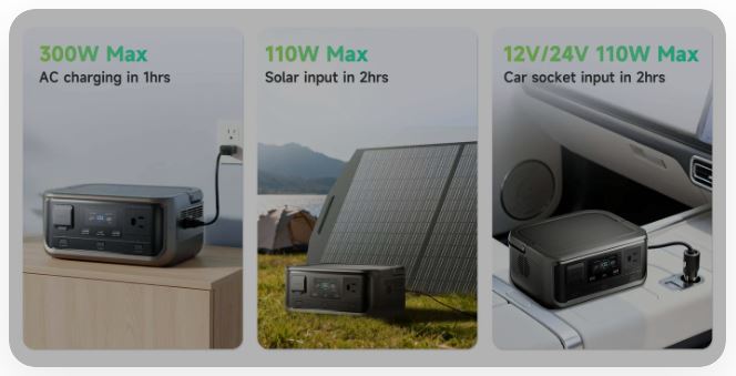Ніколи не залишайтеся без електроенергії. VOLIX P300 надає вам безпрецедентну гнучкість завдяки чотирьом різним методам заряджання: мережева розетка, сонячна панель, автомобільний прикурювач 12 В, одночасне заряджання від мережі та сонячної енергії. Це гарантує, що ви зможете зарядити свою електростанцію де завгодно — від затишку вашого дому до серця дикої природи.